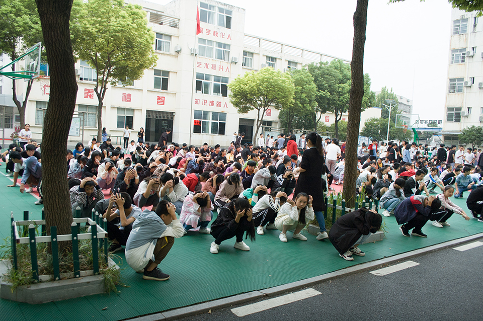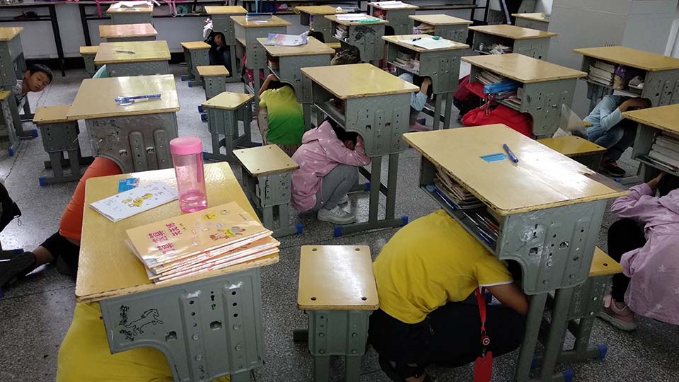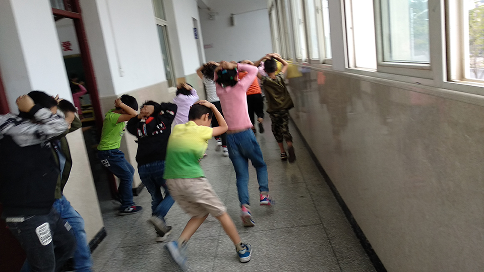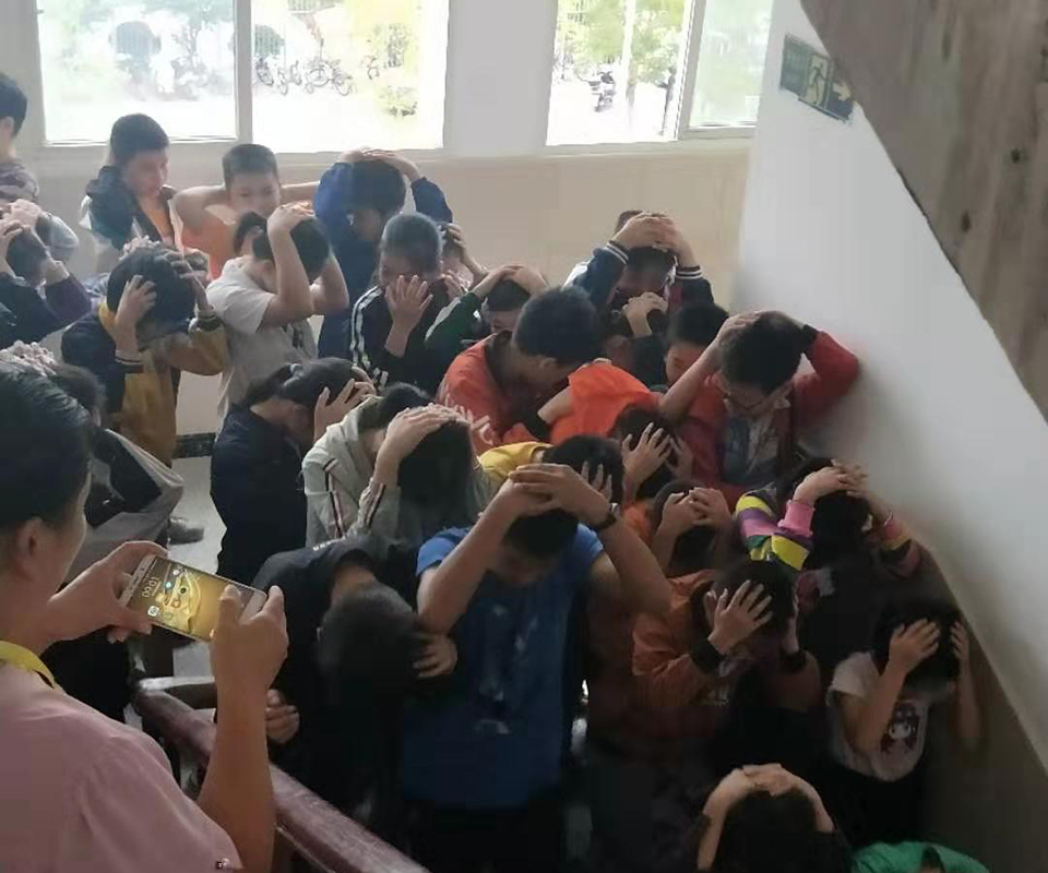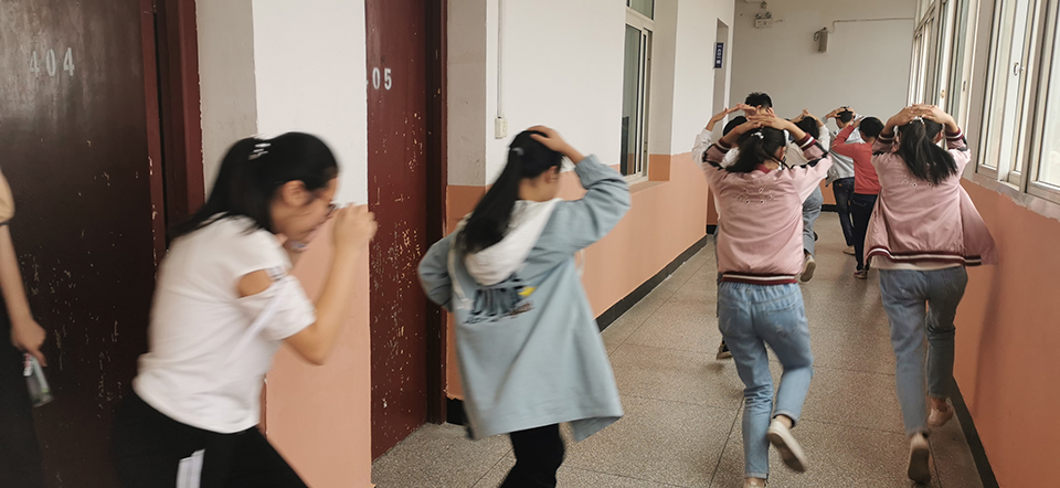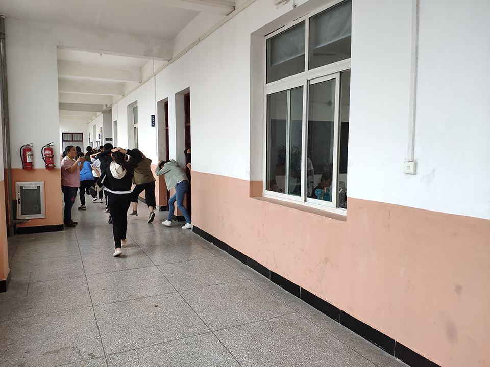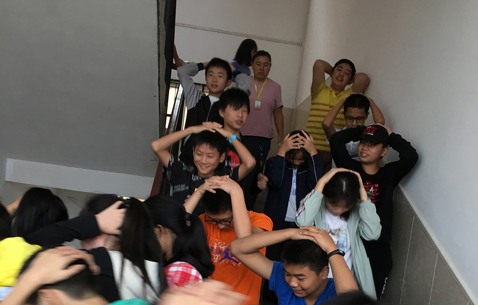 九點(diǎn)。校園警報突然響起,老師們停止了講課,迅速的組織同學(xué)們躲到桌子下面,并且觀察外面的情況,有秩序的組織同學(xué)們開始往操場上撤離。讓同學(xué)們雙手抱頭,保護(hù)好自己身體的重要部位。下樓梯時不要擁擠,防止踩踏。兩分鐘后。全體師生到達(dá)操場,在此過程中,同學(xué)們表現(xiàn)相當(dāng)積極,互相幫助,互相提醒,沒有發(fā)生任何意外!所有的老師都走在最后!