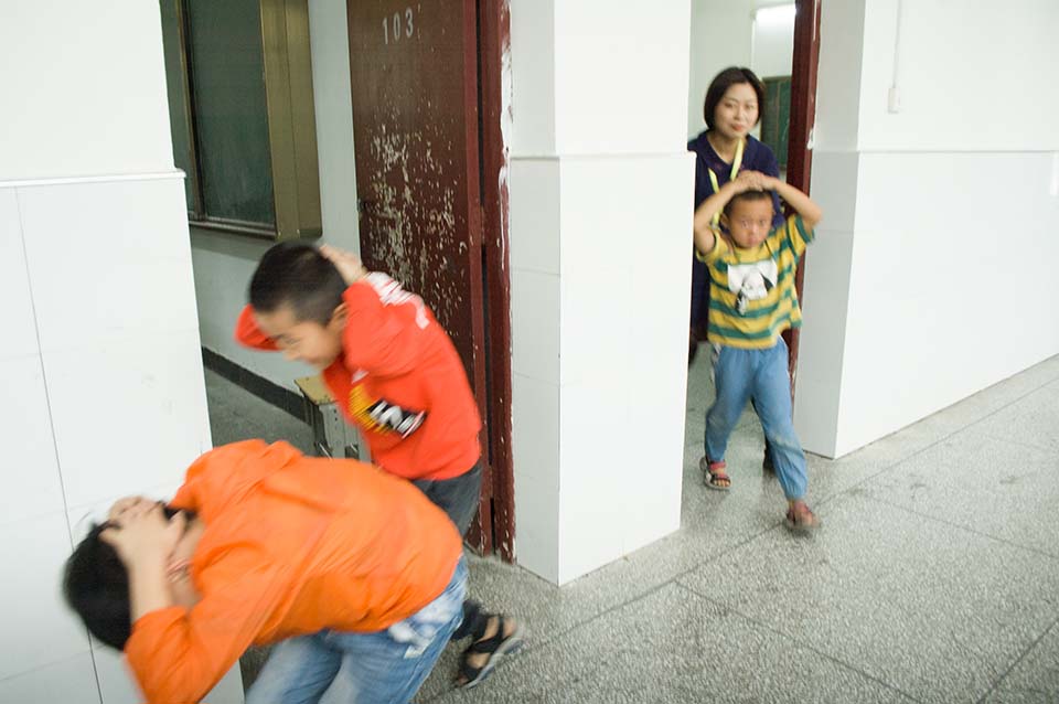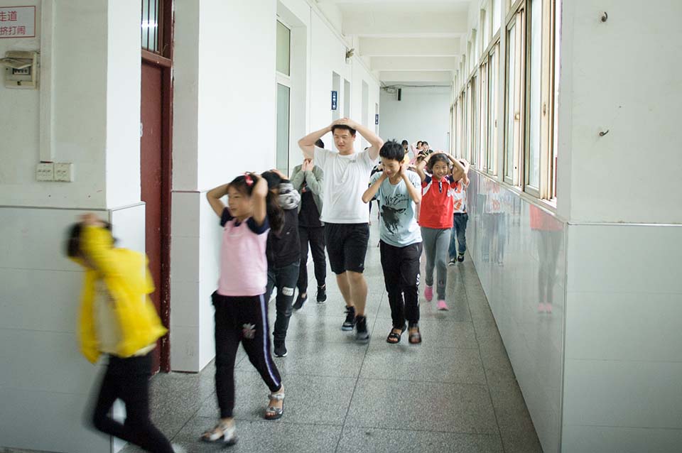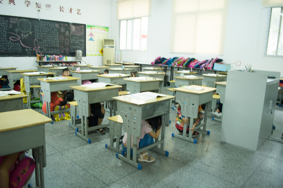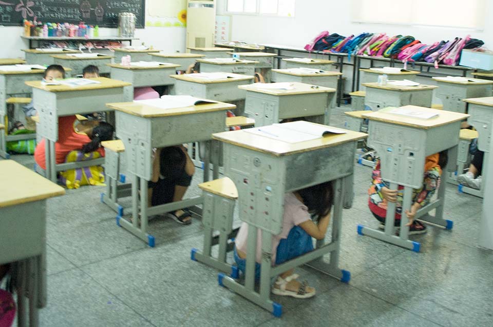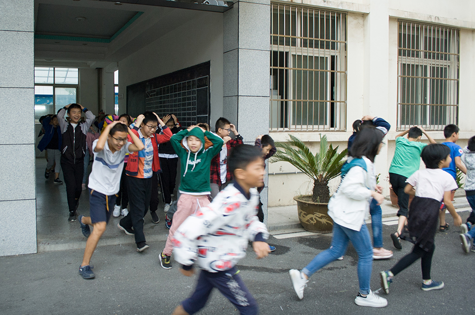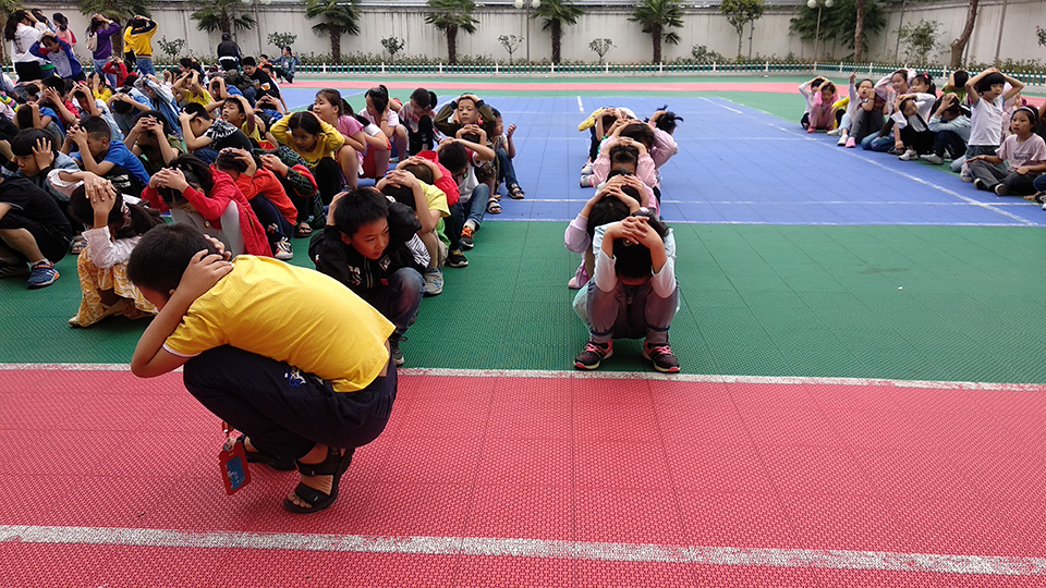 九點(diǎn)。校園警報突然響起,老師們停止了講課,迅速的組織同學(xué)們躲到桌子下面,并且觀察外面的情況,有秩序的組織同學(xué)們開始往操場上撤離。讓同學(xué)們雙手抱頭,保護(hù)好自己身體的重要部位。下樓梯時不要擁擠,防止踩踏。兩分鐘后。全體師生到達(dá)操場,在此過程中,同學(xué)們表現(xiàn)相當(dāng)積極,互相幫助,互相提醒,沒有發(fā)生任何意外!所有的老師都走在最后!